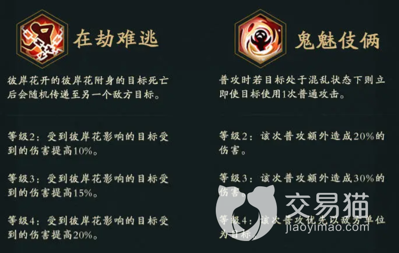 她的一个被动能力是在角色阵亡以后会随机会对敌方人员添加上标记,被打上这个标记的人在受到伤害时会有10%的概率进入扰乱状态,这个效果也会持续一个回合。另外她还有两个不同效果的天相。