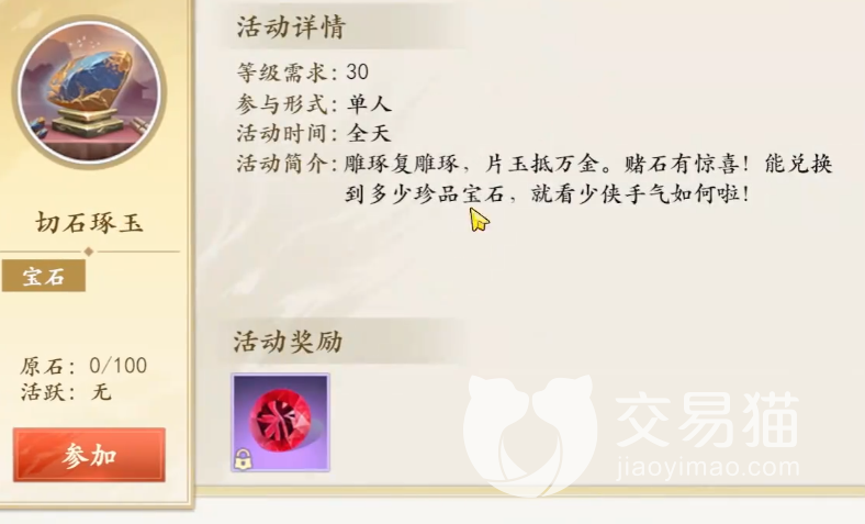首先先来讲一讲基本的玩法,所谓的切石就是使用一定的材料,然后将它切开之后就会让你获得相关的石头,石头就能够用来镶嵌在装备上赋予你装备更加强悍的属性。如果你想要参与这个玩法的话,首先你需要积攒一定数量的原石以及交子。