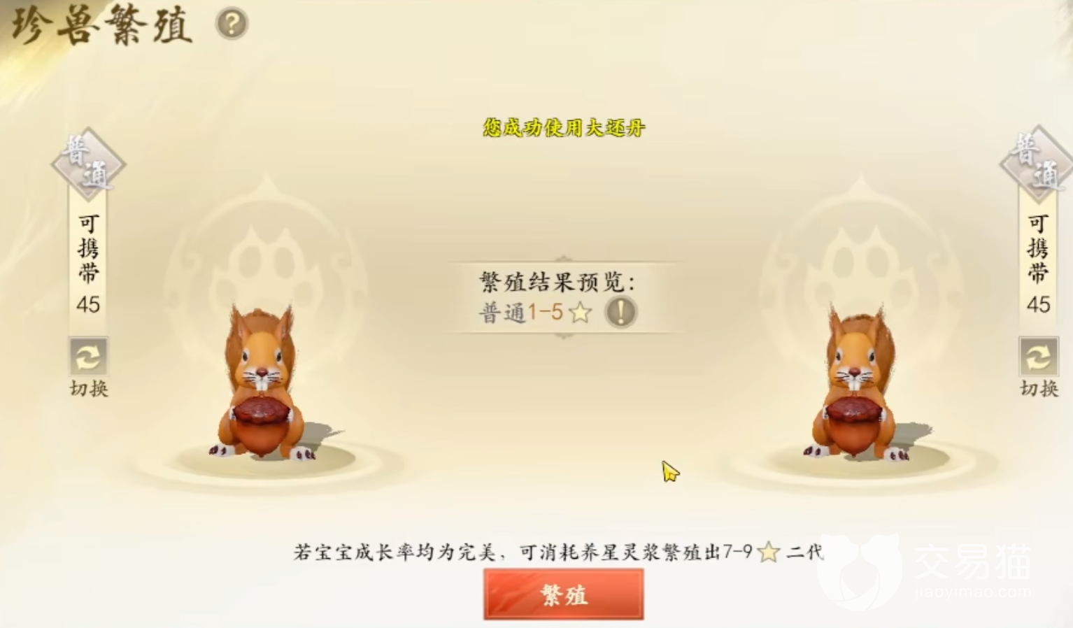 之后点击确定,就可以跳出繁衍的页面了。繁殖非常简单,只需要将一样一样的BB放上去。然后就有一定的概率繁殖成功,并不是百分百可以成功的,所以你需要捕捉更多的宠物。