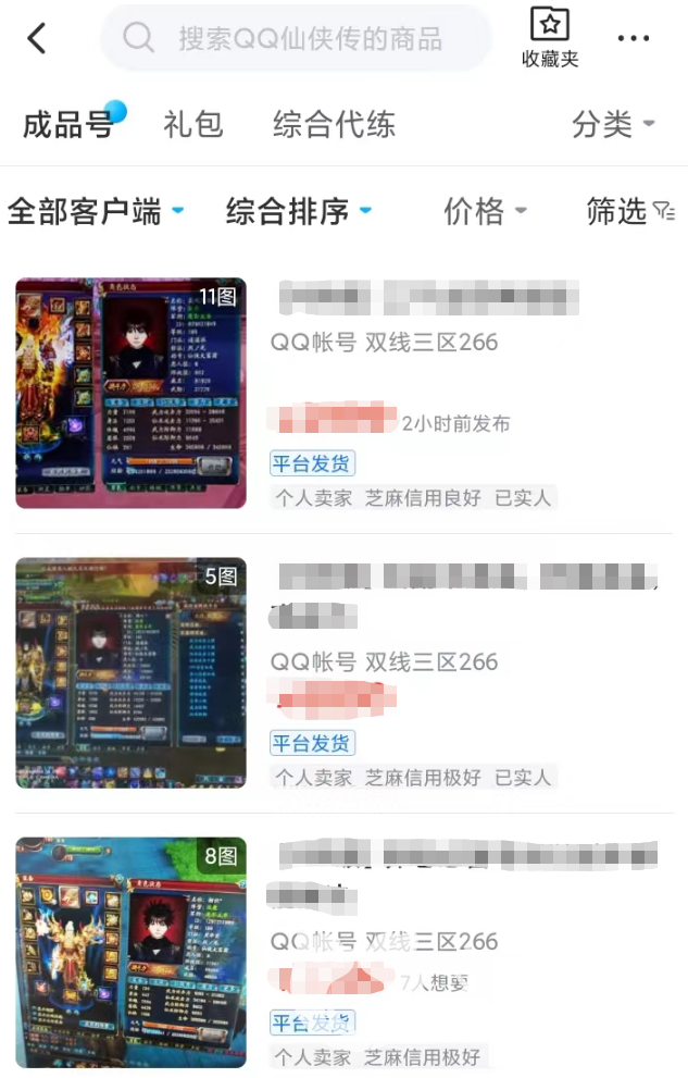 除了靠谱的交易流程,接下来这是针对qq仙侠传这款游戏的专区,在这里大家只能够看到与之相关的账号商品,玩家可以随意选择感兴趣的商品来进行挑选,并且还能够通过卖家所提供的的截图,去了解到更多的商品内容,有助于帮助各位尽早的找到满意的游戏号。