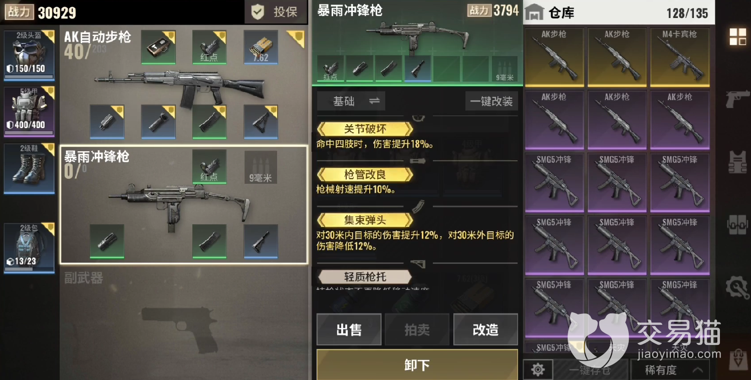 当然,如果玩家们还不了解的话,接下来再给大家带来一些成品的改装。那么,首先以较为便宜的暴雨冲锋枪为例,搭配了穿甲枪口以及轻质枪托配合急速弹匣加上防具破坏红点,可以说算是非常便宜的一套改装了,对于五级以下敌人,一梭子下去,护甲立马可以融化,如果再换上肢体破坏瞄具的话,那么哪怕打四肢也可以将五甲之下的所有敌人全部一梭子解决,破甲很快,哪怕慢了也没关系,冲锋枪换弹很快,再打一梭子就行。