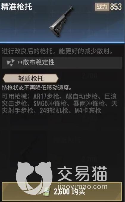 精准枪托,这个枪托的适用范围也很不错,各类型步枪,冲锋枪甚至轻机枪,卡宾枪都能装上它。能有效降低各位玩家们的枪械散步,而且更重要的是,在持枪状态下,不会降低移动速度,这一点在城市架枪作战以及追击巷战cqb当中非常有用。