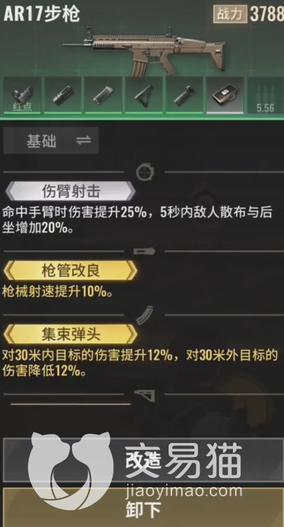 或者说配置再高一点,AK消焰器、膛线改良、加快速子弹回收和两倍伤足射击以及三级子弹。虽然配置会更高一点,但最多五枪便可以秒五级。或者继续沿用上面暴雨的配置,再将其配件装在AR17枪上再加一个握把配合上稳定装置,不仅更好压了,而且打四级也只需要五枪,非常适合平民玩家。