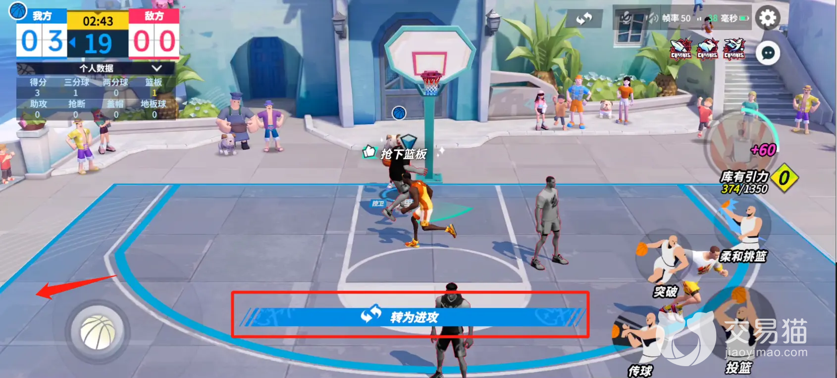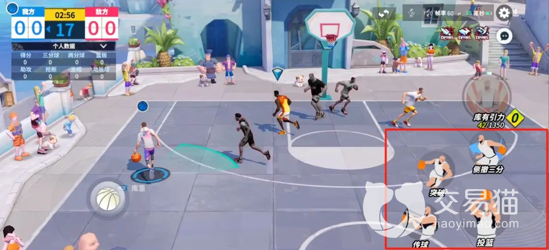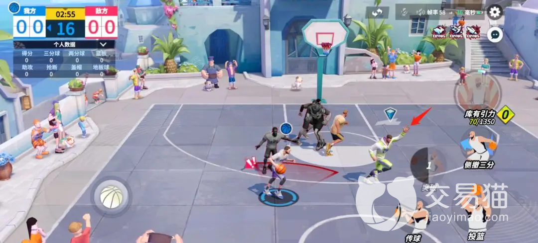 再往上一个技能是进攻技能,当角色是有球的状态这个技能就是其特有的上分能力,只要角色所操控的人物到达了对应的队伍,那么使用这个技能就可以与投篮一样产生对应的分数。而在右下角的位置,那个技能就是投篮了。只要你们前面没有太多他人所干预,那么就可以尝试投篮,同时当对方你们所操控的角色靠近篮筐的时候,再使用方向盘会有对应的上篮和扣篮的标识。