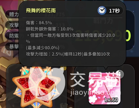 飞舞的樱花雨:像樱花一样舞动,樱花饼干会降下大范围的樱花花瓣对敌人造成伤害,如果目标是非饼干单位还会受到额外伤害,根据樱花花瓣攻击到的敌方数量,会给我方饼干增加攻击力,攻击力buff是可以叠加的,最多可以有10次,但是持续时间是12秒,需要大家注意一点,这个buff本次大招是吃不到的。