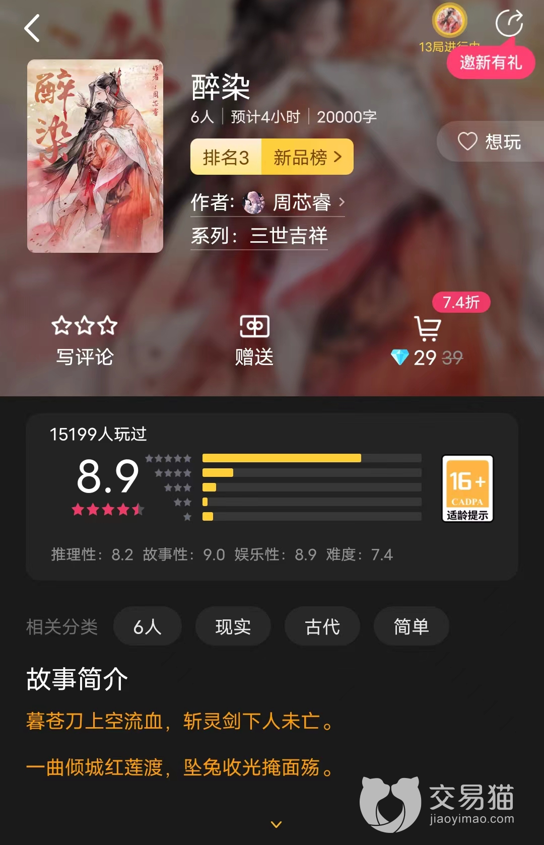 1、这是一个唯美古风类型的感情本子,讲的是一个快意江湖的故事。该本子的文本量非常的大,有着超过2W字的剧情,可以六个人一起玩。在众多的武侠题材本子中,绝对算得上是上乘的了,毕竟有着接近九分的高分。