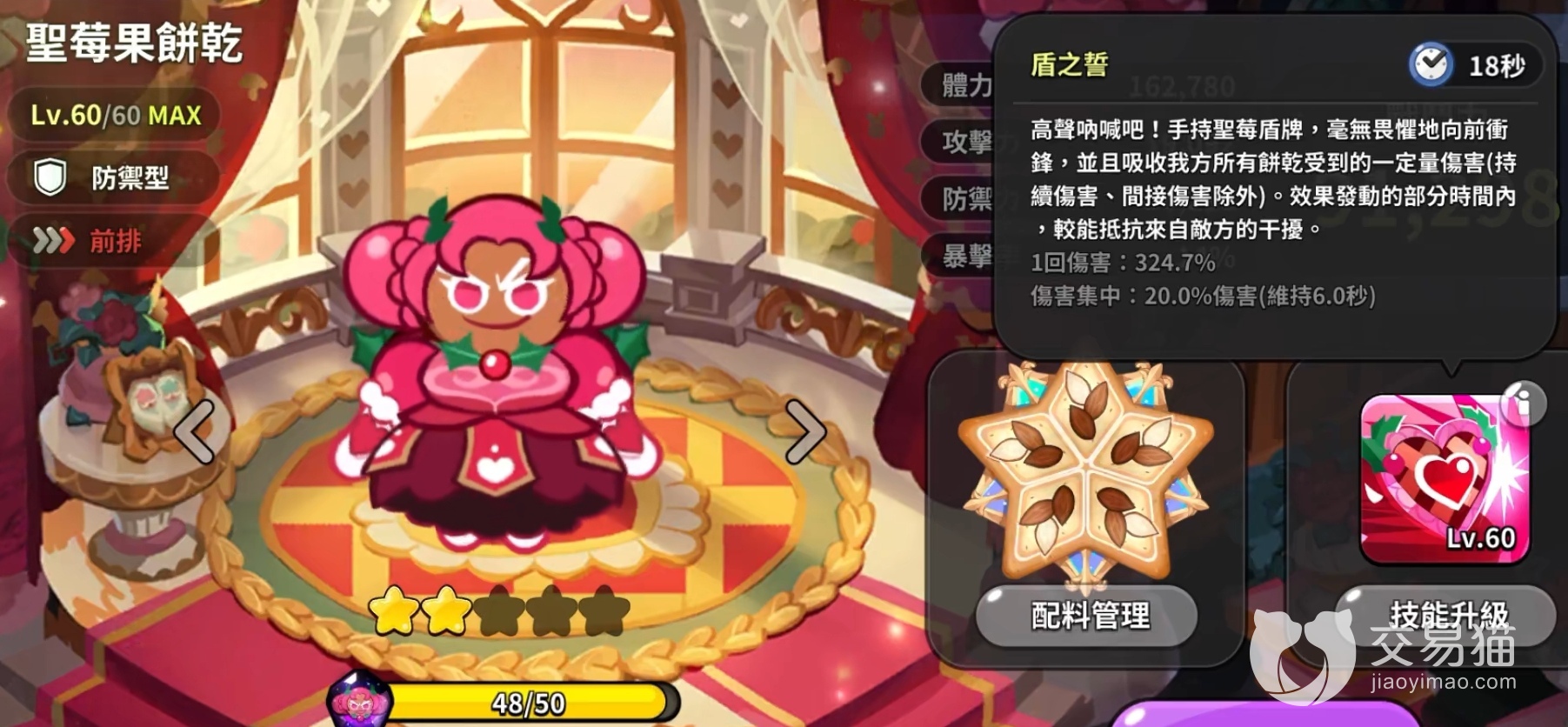 圣莓果饼干是适合新手玩家制作的一类防御型饼干,它的输出效果与防御能力都是非常不错的,放在后排可以保证稳定的输出,当然如果把它放到前排的话,也可以轻松抵抗敌方攻击,在面对敌人的时候,有它助阵战斗会容易很多。