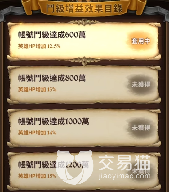 单个角色斗级提升基本就是通过上述方法来进行的,而一个账号下的总斗级则是全部角色数值总和,达到一定的斗级会带来防御力、生命力乃至攻击力的加成。450万总斗级提升1%的防御和12%的血量,到1300万斗级的时候开始加攻击力1%;最终1700万斗级能提供3%的攻击力、8%的防御以及15%的血量。