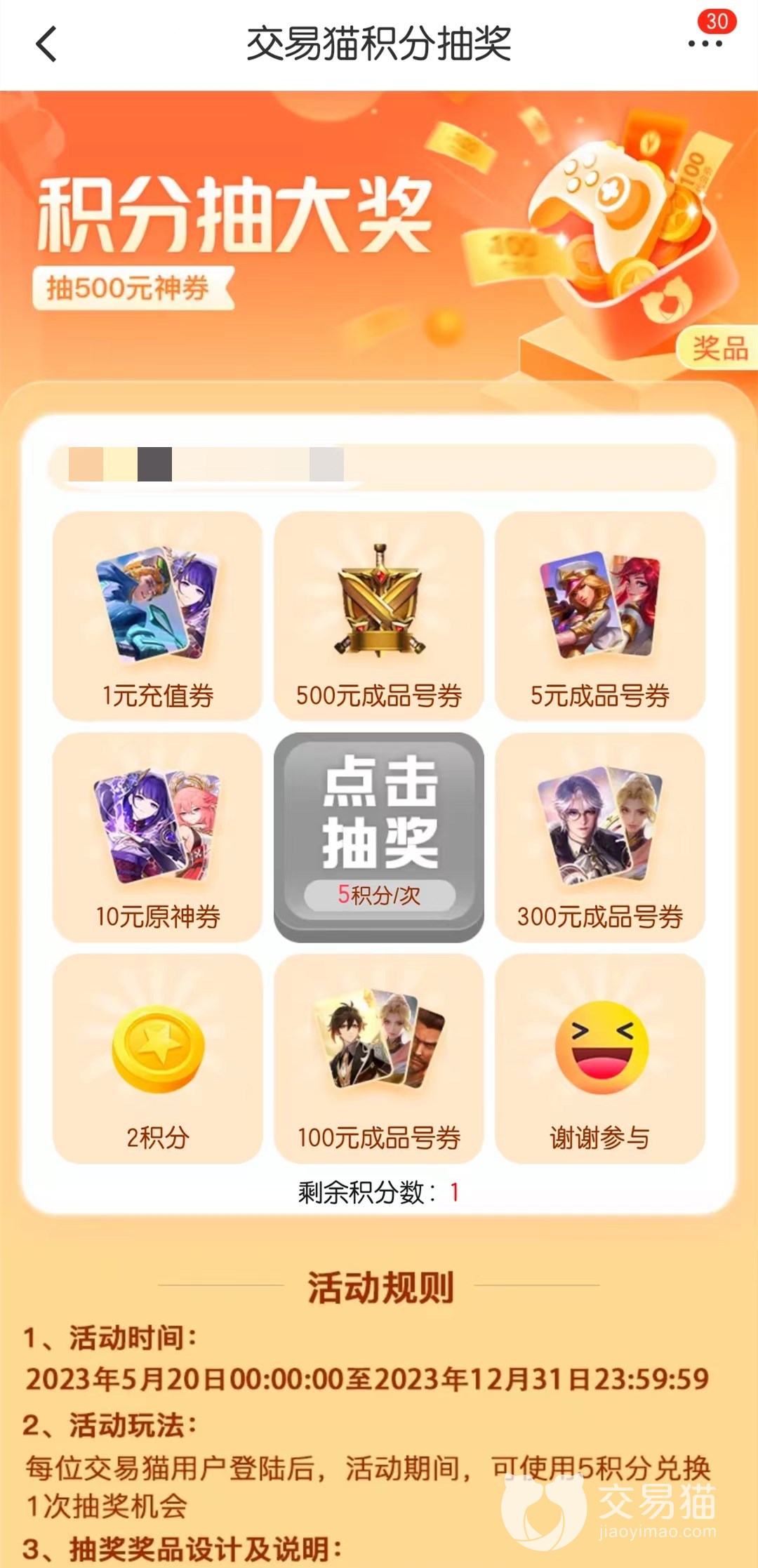 还有一个方法就是大家可以坚持登录领取积分,你的积分可以用来抽奖,最高的奖项高达500元成品号券,如果你运气好的话,说不定下一个中大奖的幸运儿就是你哟;或者在大家下单的时候积分也可以进行一部分的抵扣,不过有些商品是不支持使用积分的,所以大家在使用积分之前,要仔细的阅读交易猫平台的积分使用规则,虽然会麻烦一点,但是能省一点是一点。