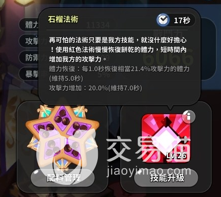 石榴饼干这张角色卡是不可以完全代替输出位置或者治疗位置的,但是石榴饼干可以作为主要辅助和奶位,石榴饼干的站位有放在中排。这个角色目前只有一种技能叫石榴法力,这个技能的介绍是在使用石榴法力的时候,每1秒位全体友方回复相当于32%攻击力的能量,而且攻击力还会增加30秒,持续时间为7秒钟,冷却时间是15秒。这个技能的总体强度还算不错。