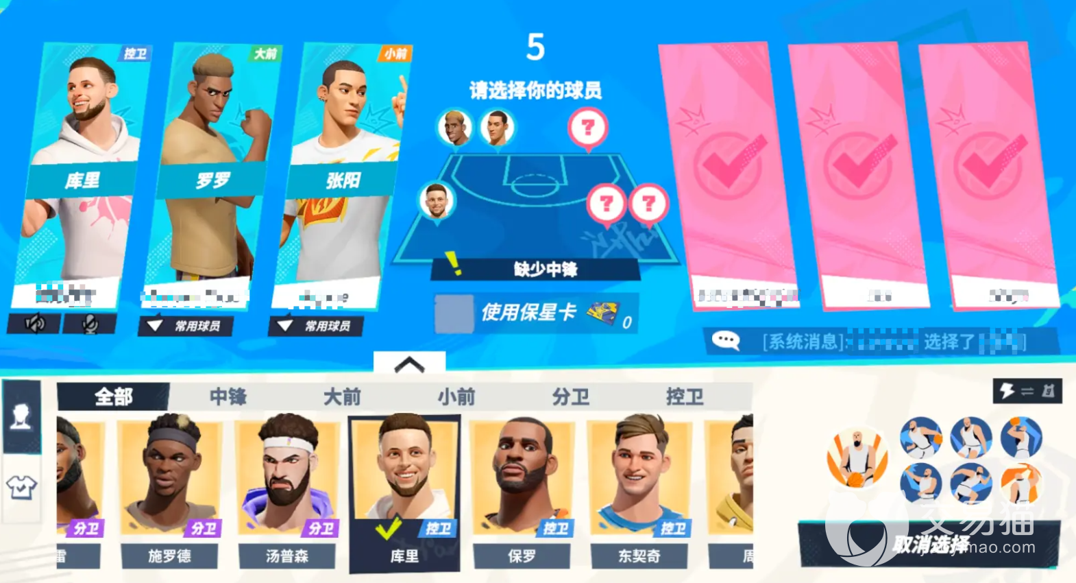 和11分赛不同,巅峰赛是匹配成功之后再来选择球员,这样你可以根据队友选择的位置来做调整,而且同一个球员无法被重复选择。一般是根据阵容需求选择合适的球员,比如说1内2外的搭配,或者3外,并没有严格要求必须什么样的阵容,如果你技术过硬的话。