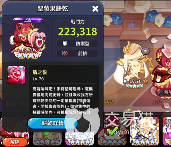 第二个推荐的话就是圣莓果饼干了,她也是一个强有力的输出型饼干,这个饼干做过一次改版的,更新之后无疑更加增强了,大招的释放是非常快速的没有什么前摇,可以说是秒释放,她在输出高的同时,自保能力也是不俗的,可以说是不仅仅是伤害高,也是一个比较肉的存在,能够放在前面顶一顶的伤害的,伤害吸收能力也是可以的。