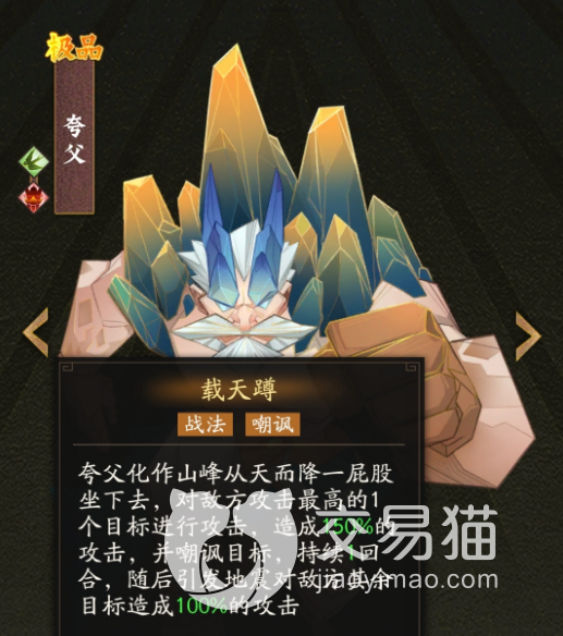 觉醒技能是在一次行动之后会触发的,目标也是针对己方成员,为这名成员带来一个守护的效果,守护期间这个角色受到伤害的时候,伤害是可以跟夸父一起承担的,相当于一个分担伤害的技能,不过夸父也只能承担30%的数值,在夸父的生命只有30%的情况下这个技能是不会触发的,战法技能是攻击技能,有150%的攻击之外还可以带来嘲讽效果,要是引发地震还有额外100%的伤害。