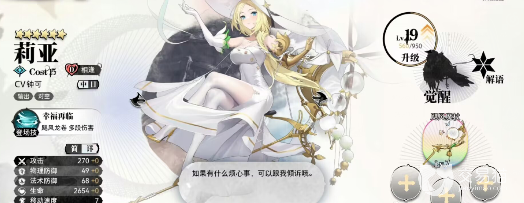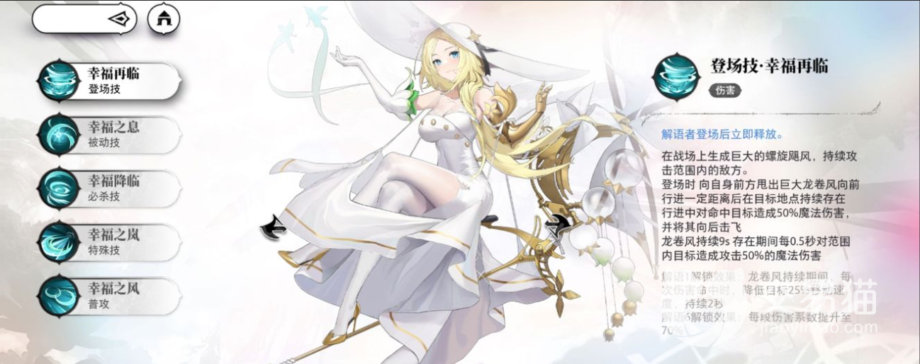 首先是关于莉亚的技能介绍,莉亚的登场技能幸福再临,莉亚会制造一个飓风,对范围内的敌人造成50%魔法伤害并将其击退,持续9秒,该技能还能够造成短暂控制效果,可以有效地控制敌人群。莉亚的必杀技能幸福降临,莉亚会利用全身魔力凝聚成一道巨型风刃向前方发射,对全屏敌人造成三段依次为53%、68%、106%攻击力的伤害,且该技能无需蓄力,可在战斗中快速释放。