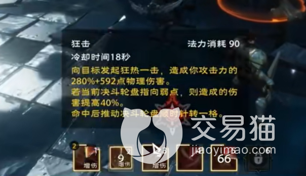 第三个技能是狂击这个技能冷却时间是18秒,消耗90点法力值,对敌人造成狂热一击,造成自身攻击力的280%,这个技能也是有背刺弱点这个被动,这个技能可以提升自身的暴击率。