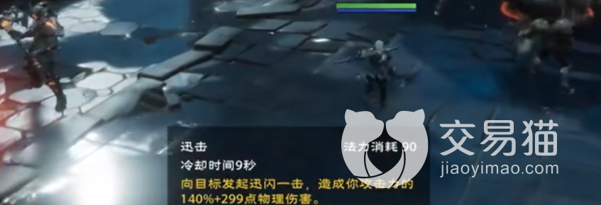 第二个技能叫迅击,这个技能也是需要消耗90点法力值,冷却时间是9秒钟,向目标发起迅闪一击,造成自身攻击力的140%,如果轮盘指向敌方弱点,也可以打出背刺状态,这个背刺状态跟自身的被动一样,可以额外增加角色40%的攻击力。这个技能伤害一般般,但是可以让敌人掉血。