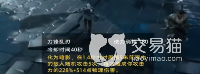 第四个技能是刀锋乱刃,冷却时间是40秒,消耗180点的法力值,可以化身成为暗影,在1.4秒内对范围5里面的敌人随机攻击5词,每次造成228%的伤害。