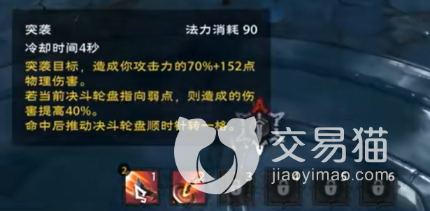 首先这个角色一共是拥有6个技能,随着等级提升而解锁,第一个技能就是我们的突袭啦,需要90点的法力值,冷却时间是4秒,可以突袭目标,对目标造成自身攻击力的70%,如果轮盘方向指向弱点的话会提升攻击力造成40%的伤害,这个技能像是一个刺客类型的技能一样,玩家们需要好好利用一下哦。