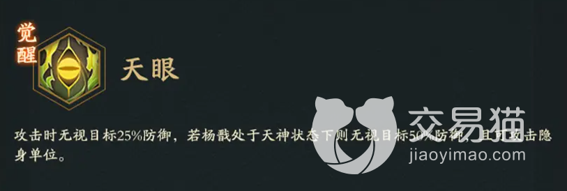 杨戬被动是让哮天犬协同攻击,某种程度上算是一种连击,而且哮天犬也能偷取气势。觉醒之后的杨戬开了天眼可以看到隐身单位并且能无视敌方50%的防御,是对隐身特化的攻击角色。天相推荐用“清源秒道”能有效遏制对方的一个大招,“二郎圣显”则是强化被动输出。总体而言杨戬是一个不错的仙族输出位,而且坦度也不错,一般是搭配另一个强力输出,比如说黄飞虎(收割)来组队,再配上沉香保生存、青龙挂debuff加补刀。