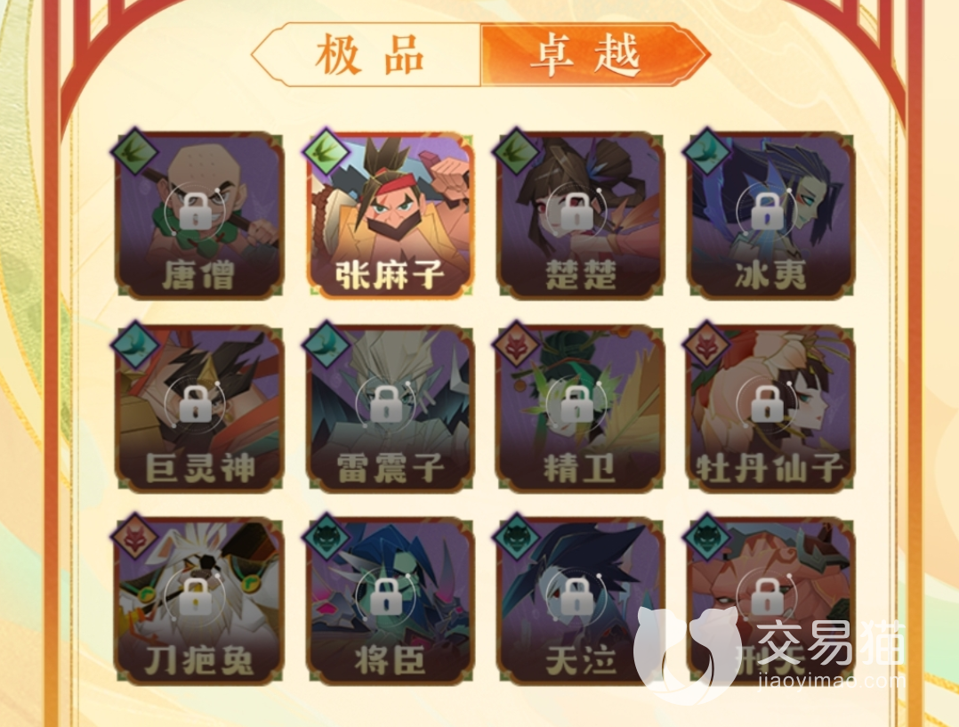 卓越(紫卡)候选也12个,分别是唐僧、张麻子、楚楚、冰夷、巨灵神、雷震子、精卫、牡丹仙子、刀疤兔、将臣、天泣、刑天