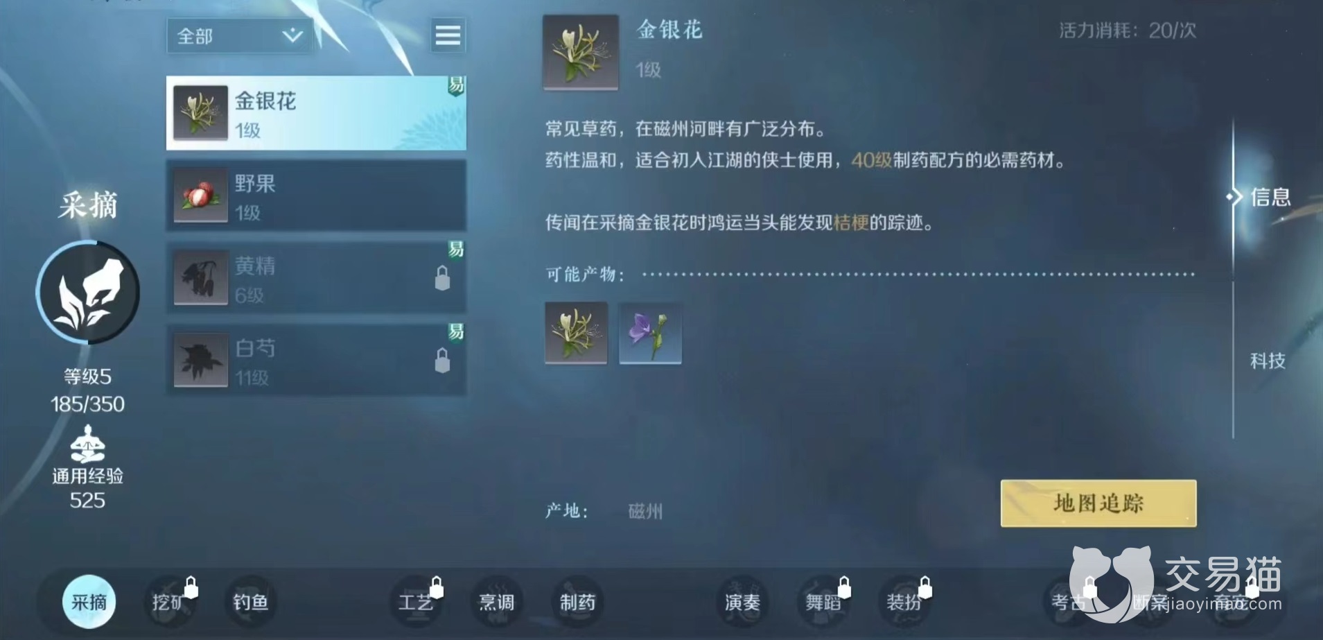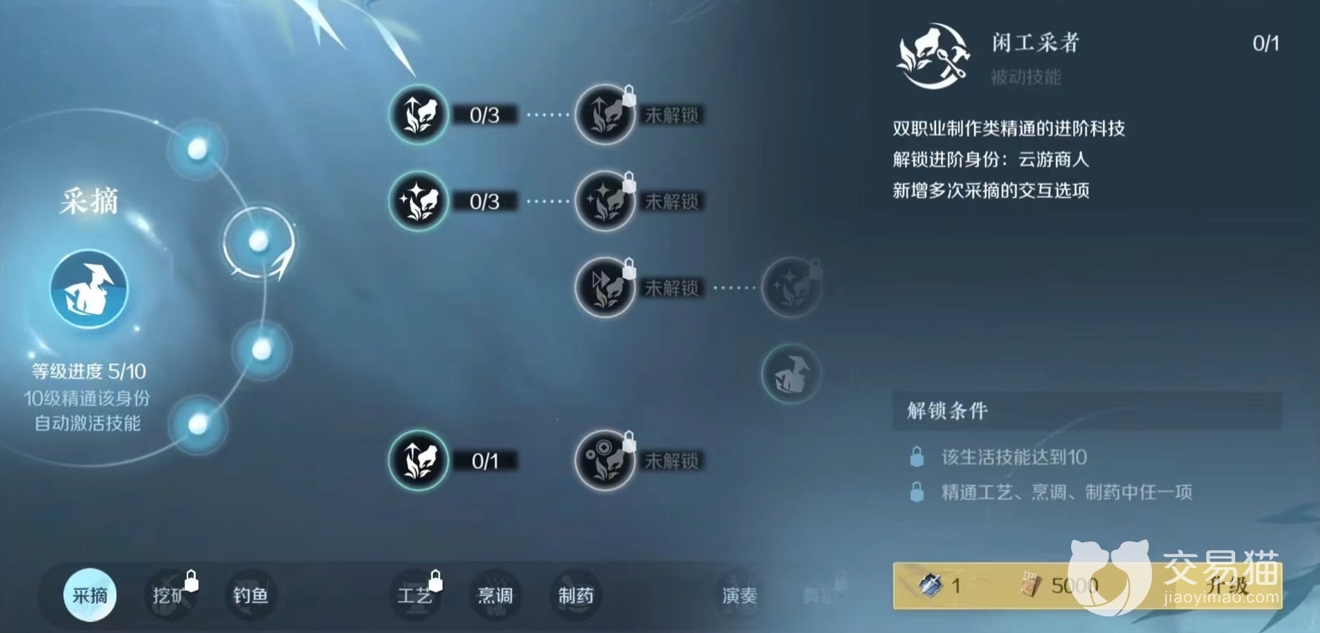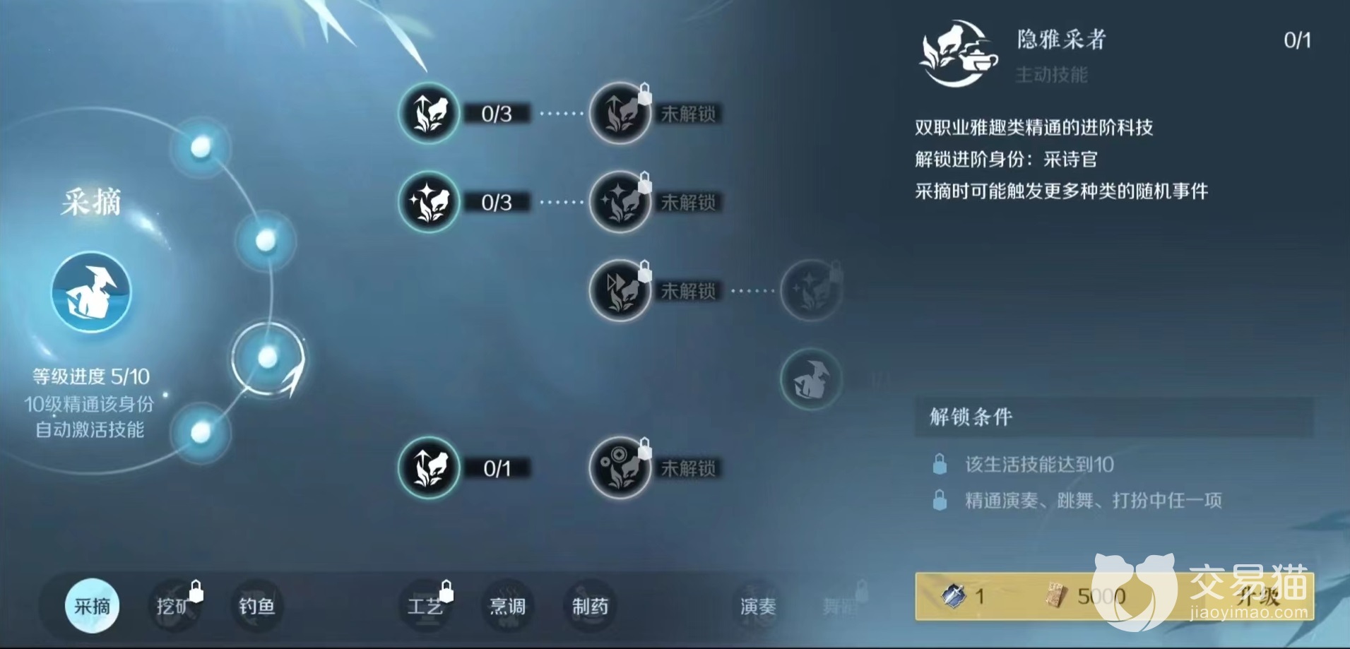 需要明确的是采药仅仅是一种基础身份,游戏中虽然身份有很多,但是有一些不能直接选取,需要从基础身份的基础上进阶。采药可以进阶的有4种,分别是隐士,采诗官,云游商人和拾荒者,每种身份都有自己独特能力以及不同解锁条件,需要不断完善技能等级,才能够成功进阶。而要想达到这4种进阶身份,需要先将采摘升到10级精通。方式也很简单,就是不断消耗活力在地图上采集,如果不想依靠采药来赚钱,可以随意去采,只要能快速冲等级就可以。