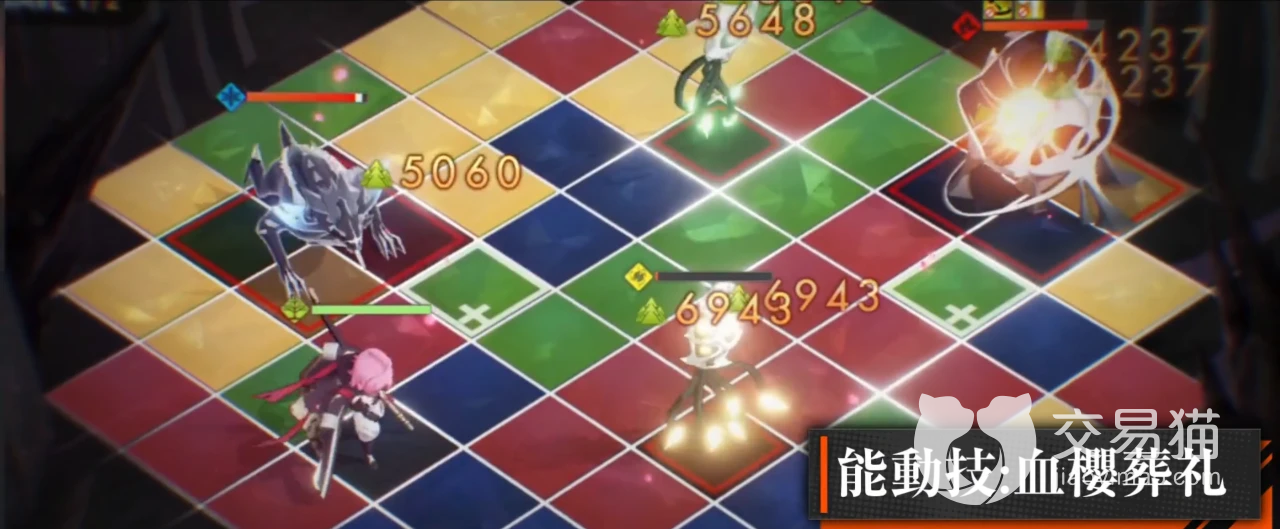 接下来说一下绯这个角色的技能吧,绯是一个主打爆破的光灵,属性是森,血樱葬礼是绯的主动技能,这个技能启动的时候能够将棋盘上的两个格子转化成属于绯自己属性的格子,并且对处于周围的对手造成损伤,但是这个技能有三个回合的冷却时间,如果绯在作战的时候能抢在对手前面先升到三级,那么是可以占很大的对占优势的。