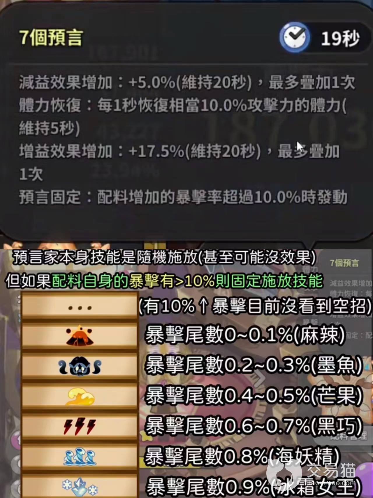 暴击率尾数处于0~0.1%可以触发麻辣预言,处于0.2~0.3%可以触发墨鱼预言,处于0.4~0.5%可以触发芒果预言,处于0.6~0.7%,可以触发黑巧预言,暴击尾数处于0.8%可以触发海妖精,暴击尾数处于0.9%可以触发冰霜女王。其中如果你的暴击率处于10%以上,则有可能会固定释放技能,如果处于10%以下这个技能有可能会没有效果,这个暴击率指的是配料本身的暴击,所以这个就需要很大的门槛,玩家需要提前获取这些含有暴击率的配料,才可以搭配出更好的效果。