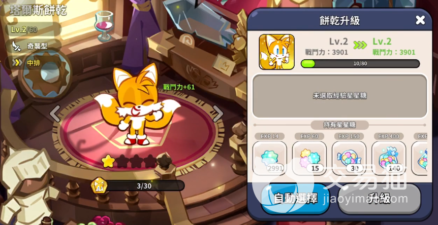塔尔斯这个饼干人也是大家常用的,它在外形上看起来一点都不像饼干人,因为是一个小动物的外形,看起来就是一只小狐狸,它属于中排的角色,技能上可以连续弹跳起来,造成一个弹跳攻击,并且在攻击成功之后给己方的饼干人带来防御增加的效果,防御可以持续7秒钟的效果,但是这个技能是比较看命中度的,如果命中率高的话,技能会成功也会带来输出,如果命中率太低,这个技能放空,所以建议大家将这个角色培养以后使用。