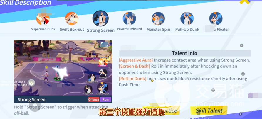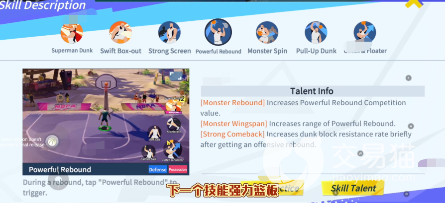 常规技能2:强力篮板,可以增加霍华德成功抢到篮板的概率,它同样会随着技能等级的提升来不断获得新的效果,一级时可以增加自己的篮板属性,二级时增加抢板的范围,三级时可以让霍华德在抢到进攻篮板后下次扣篮获得额外的抗盖帽属性。
