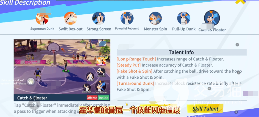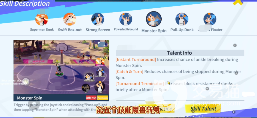 常规技能5:闪电抛投,效果是接球后立刻出手抛投,它不同于前面几个常规技能,其可以升级四次,一级时可以增加技能的最大触发范围,二级时增加技能的命中率,三级时新增一个假投后转身突破的动作,四级时可以让你在转身突破后获得额外的扣篮抗盖帽加成。