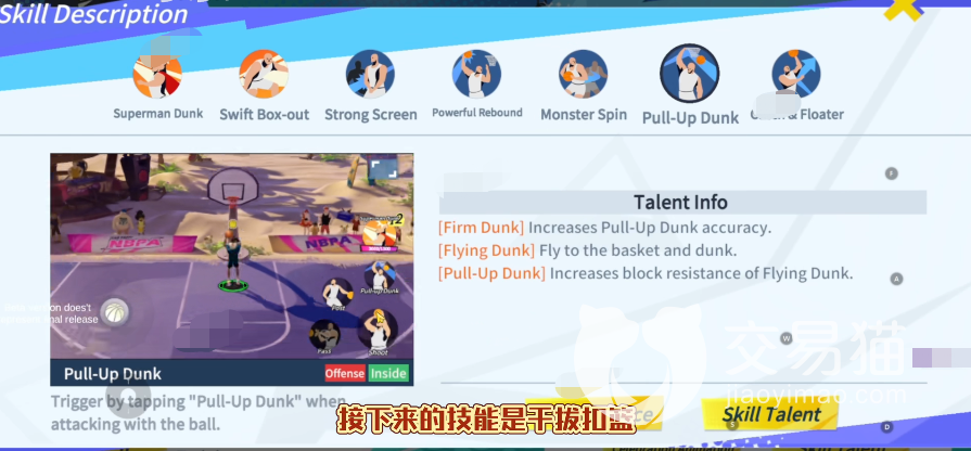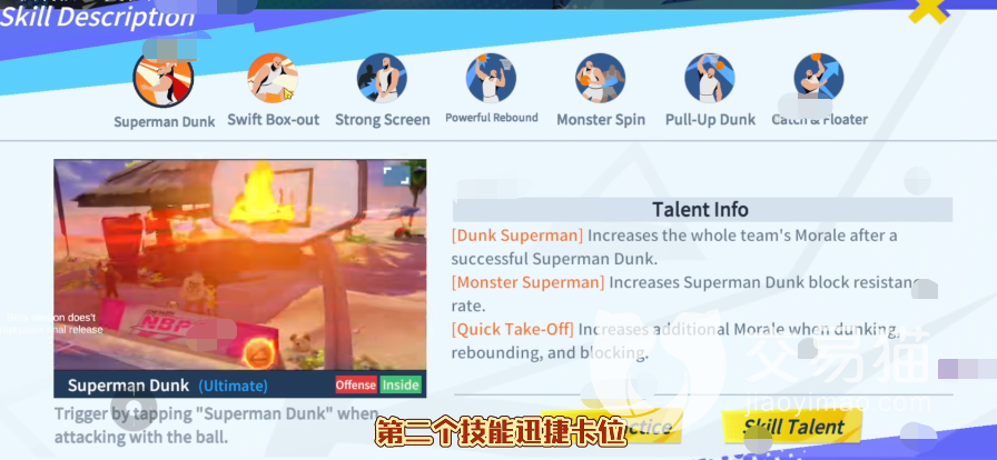 常规技能4:干拔扣篮,该技能可以令霍华德在篮下时直接强起,从而进行一次享有抗盖帽加成的站扣,这次站扣的抗盖帽加成不同于前面几种扣篮,它的数值要高很多,所以常常会出现将防守人扣翻在地的壮景。该技能有三次升级,一级时增加扣篮的命中率,二级时增加扣篮的范围,并新增一个三步扣篮的动作,三级时会额外增加该技能的抗盖帽。