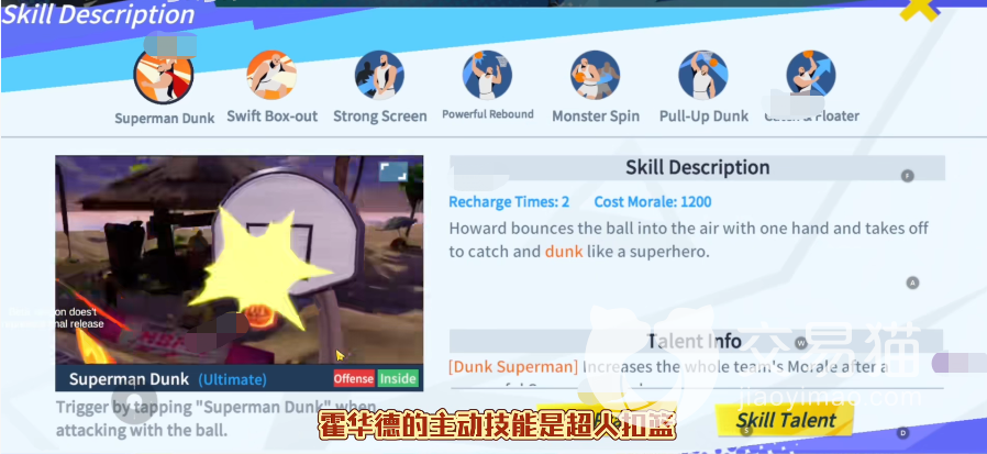 核心主动:超人扣篮,使用后霍华德穿上超人披风高高起跳进行战斧劈扣,一级时它可以在使用后增加全体队友的技能能量,二级时则可以增加这记扣篮的抗盖帽和抗干扰,三级时会令霍华德在成功扣篮,抢板和盖帽时获得一个额外的绝技能量。