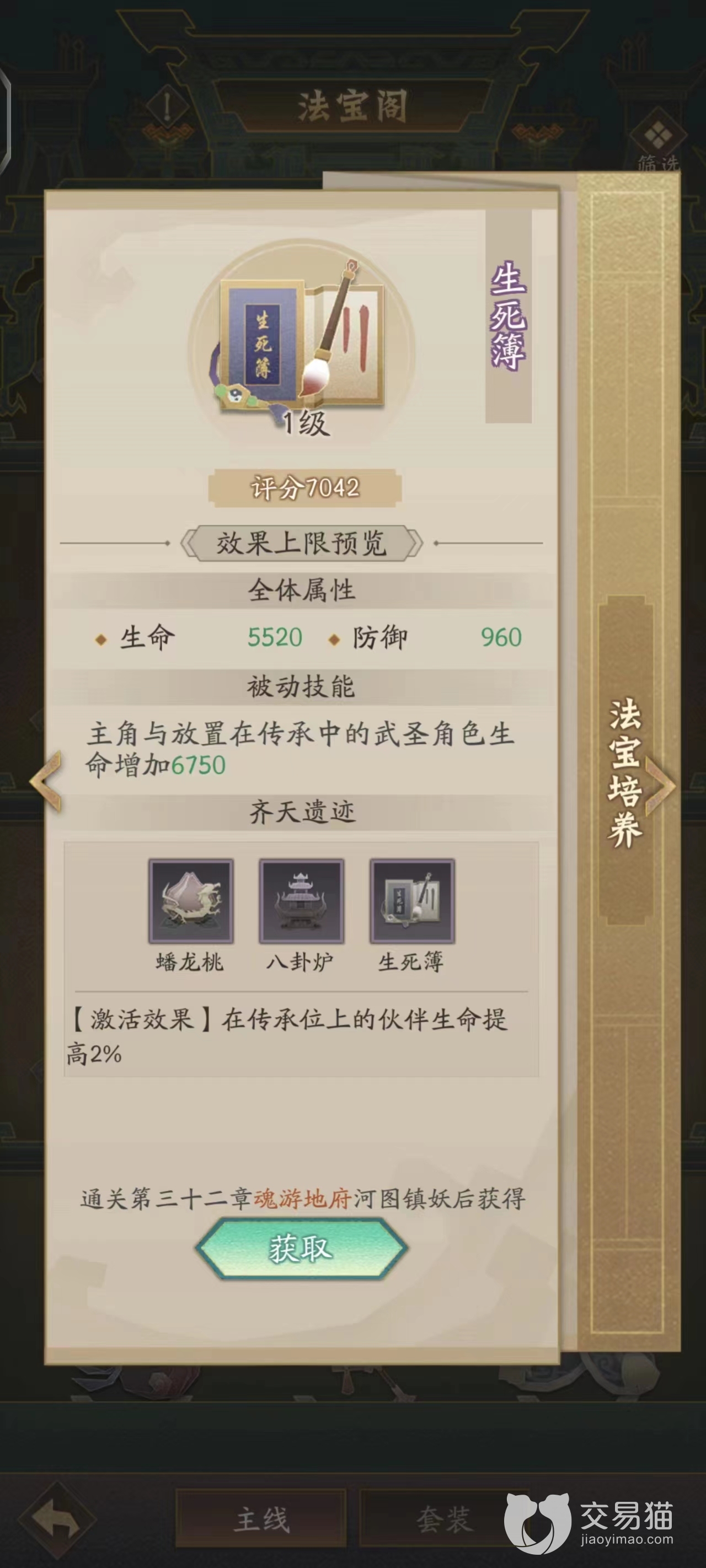一件法宝的上限怎么样,首先还需要结合它的评分来看,可以看到生死簿的评分达到了7042的水平,这个水平对比其他法宝算是比较高的,它在整个游戏的法宝中也已经达到了中上游的行列,而且这个评分还只是在一级时候的数据,所以其后续的潜力更是令人期待。
