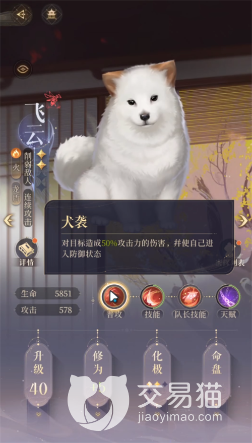 先来介绍下,飞云的普通攻击技能——犬袭。每次攻击可对敌人造成50%的物理伤害,同时使自身进入防御状态。这个效果是龙盾职业角色的专属普攻效果,让飞云在战斗中更加耐久。