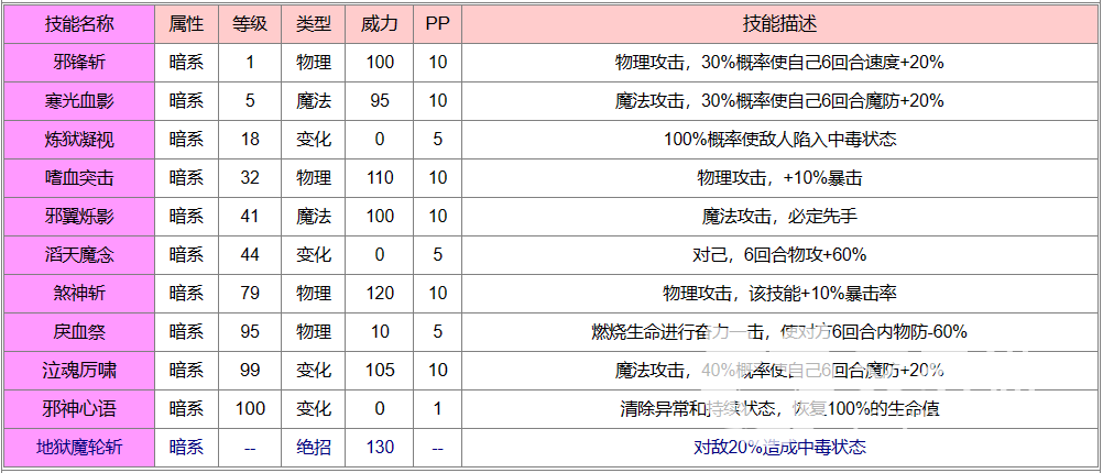 恶魔咆哮的特点是它拥有着极高的攻击力和速度,能够在短时间内造成巨大的伤害,同时也具备着一定的防御力和生命值,不容易被一击击败。它的主要技能是炼狱凝视(pp:5点),可以对敌方精灵造成物理伤害,并有一定几率(满级100%)使其陷入中毒状态。恶魔咆哮还可以使用其他一些技能,如嗜血突击、寒光血影、滔天魔念等,增加其战斗的多样性和威胁性。