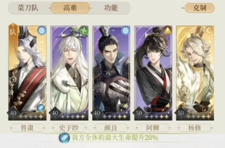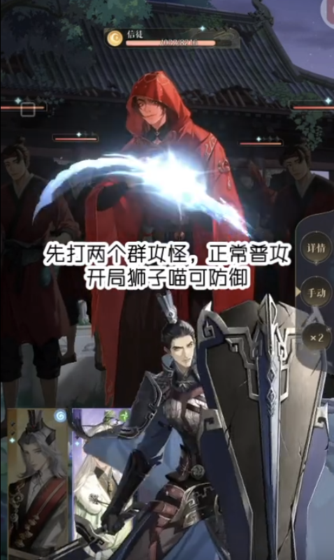 首先说下阵容搭配,这套阵容以鲁肃为核心,再配合上史子吟以及颜良,最后再由阿婵和杨修打辅助。这套阵容强就强在他有一个连携技,可以让所有角色生命值提升百分之二十,提升阵容整体坦度。这一关的敌人是5个信徒,其中两个是群攻怪,伤害特别高,玩家需要优先解决这两个伤害怪。