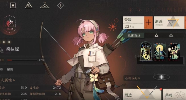 虽然莉拉妮只是一位三星角色,但她的输出能力并不低,并且其本身的兽属性也能很好地克制前期的大部分怪物,更何况大招还是极为好用的群攻技能,搭配上十四行诗能在前期通过两个大招将敌人全部秒完,是玩家在开荒时最好用的角色之一。同时,玩家培养该角色能获得返还材料,相当于只用零成本就能将莉拉妮练到洞悉一之后。