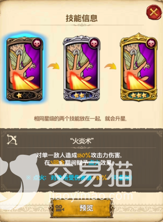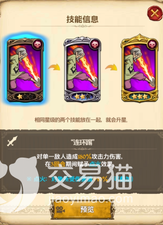 没升星之前和连环踢一样造成单体伤害和点火效果,升到2星便可以解除单一敌人的增益效果,对于那些可以大幅增加队友攻击力、防御力加成的团队增益型角色,被命中后原形毕露,三星后再解除增益效果的同时可造成相当于自身攻击力3倍的爆发伤害,并且在4回合期间赋予2个点火效果。