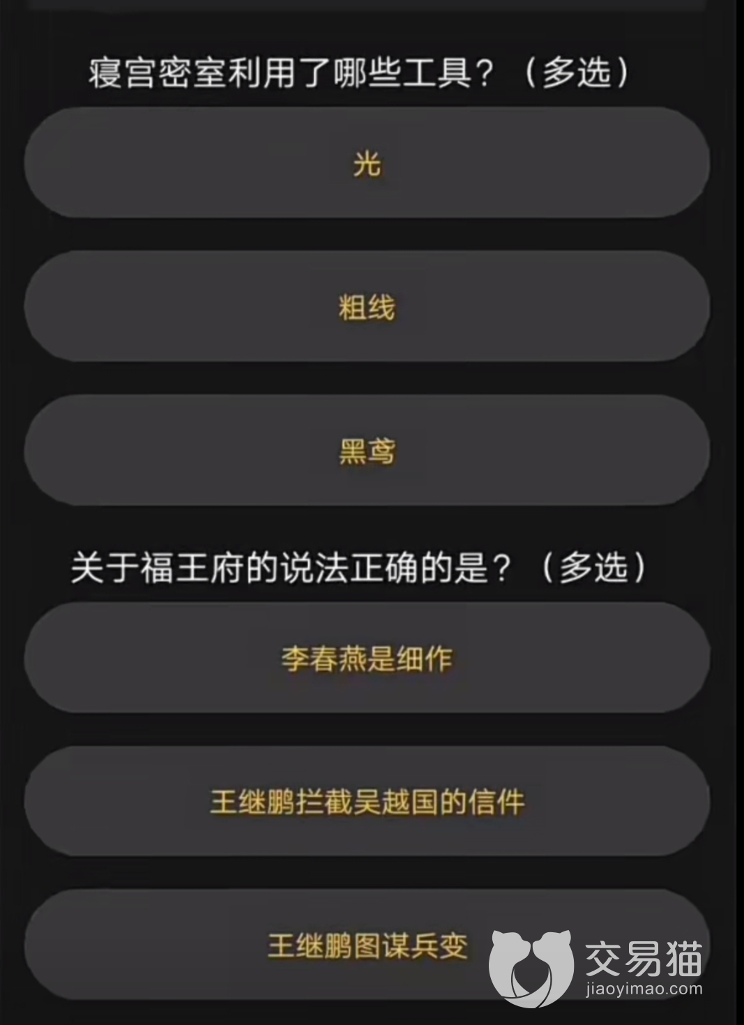 首先小编分享一下有关解密的答案。建王府密室密码是李世民,箱子的密码是夫妻。泉王府盒子的密码是琴。皇帝寝宫暗格的密码是归守明。
