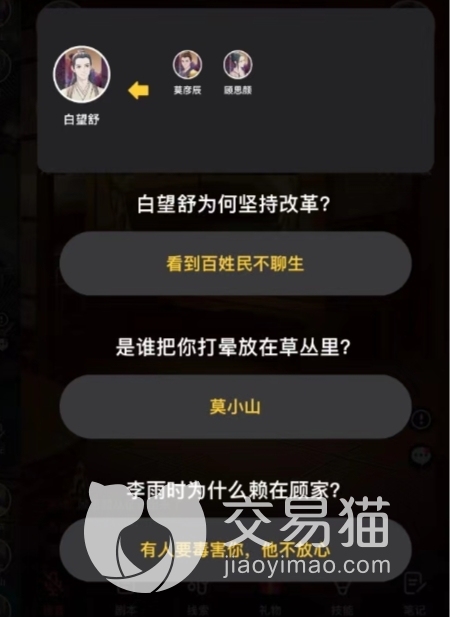 在第三幕中白望舒为了保护莫彦辰和绿涯,对他们视而不见。并且他一直坚持改革,与户部尚书李铁志同道合,但是因为李铁被永安侯买凶杀害了,所以白望舒为了百姓,为了李铁杀死了永安侯。