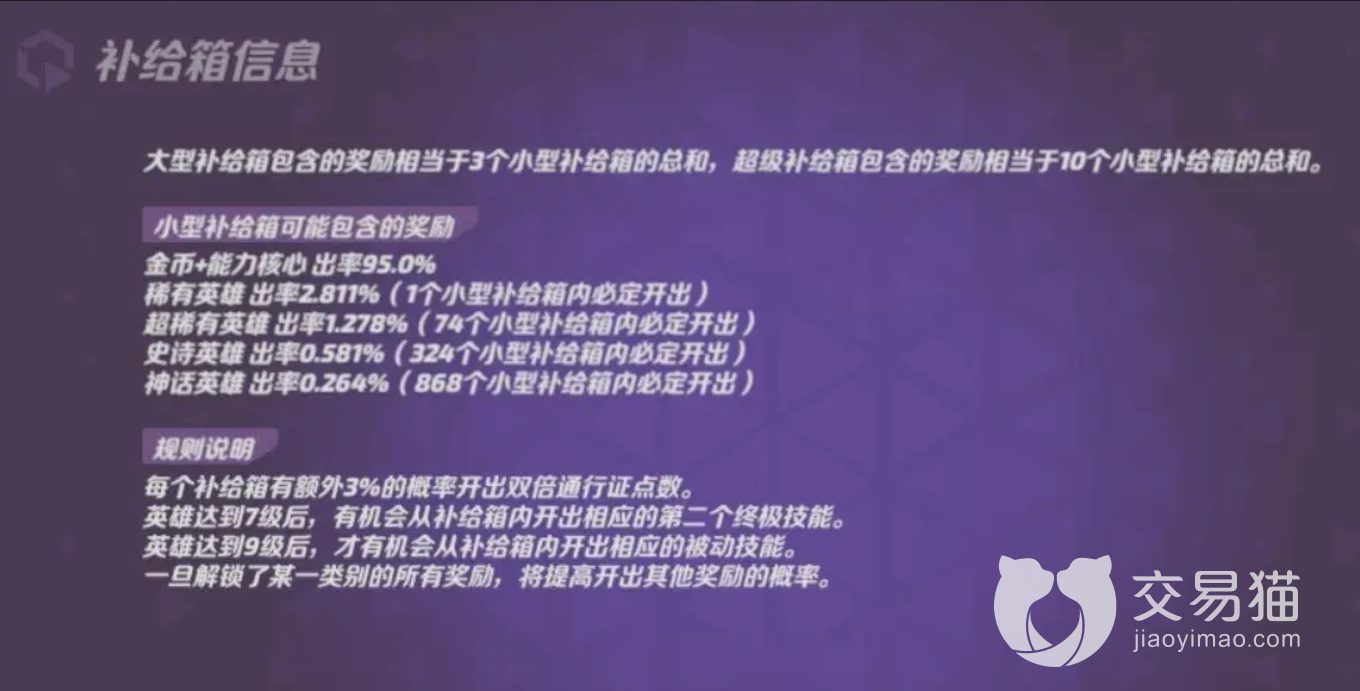 补给箱在可以大概开出金币和能力核心的同时,也能小概率开出不同品质的英雄(随着品质提高概率降低)。