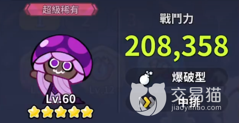 毒蘑菇饼干人在外形上非常好辨认,就是一个毒蘑菇的形状,全身都是紫色的,这个饼干人也是一个五星卡,要是用这个角色的话,大家还是比较适合放在中排使用的,因为它的定位其实是一个爆破型的角色,所以输出上面还算可以。
