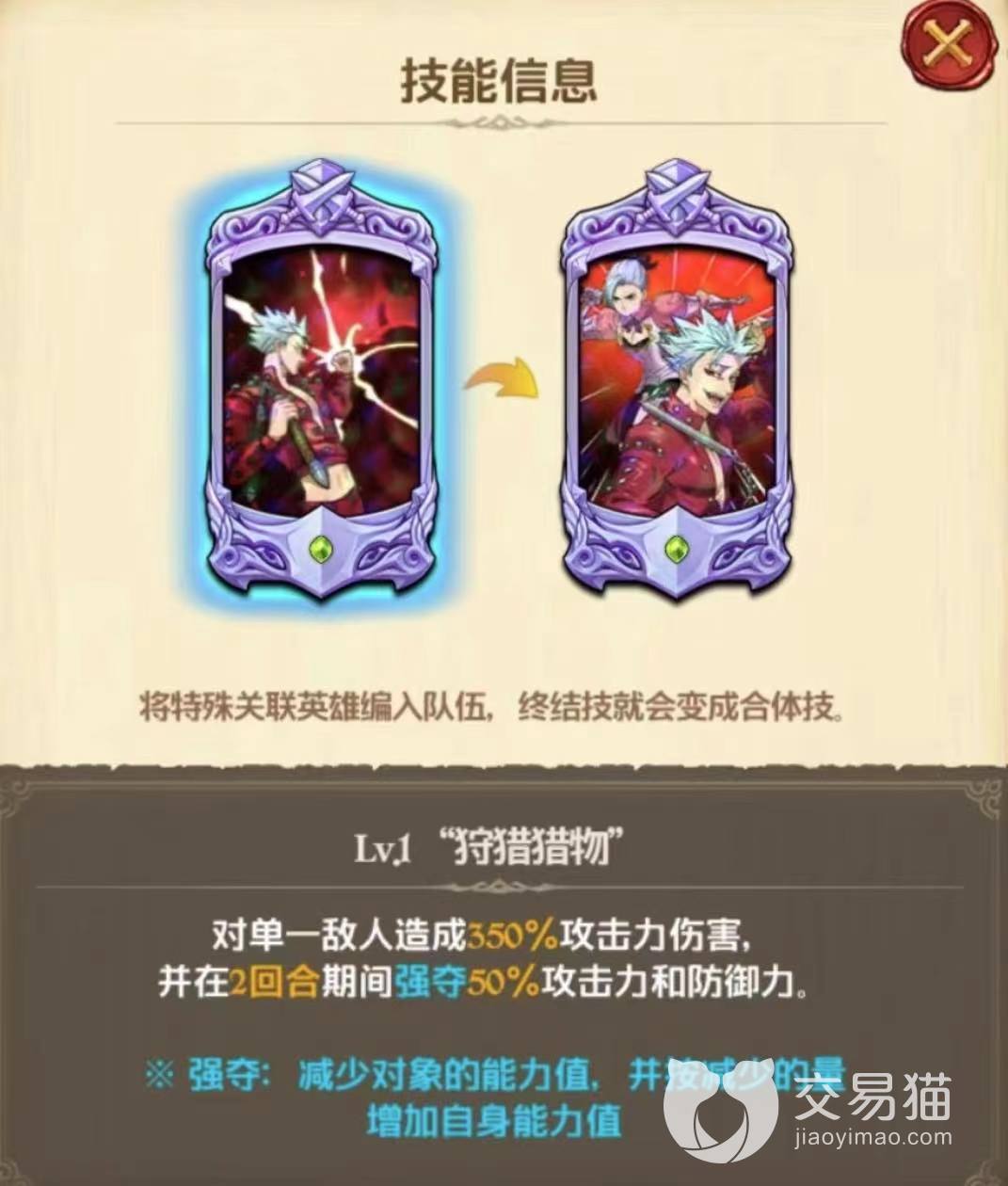 终极技能,狩猎猎物,可以对单一目标敌人有技能伤害,既有群体输出也有单体伤害,这个英雄是非常强的,而且在阵容搭配上也会有更多的选择性,还能将特殊的英雄编入队伍,和它一起组成终结技能,就会变成合体技。