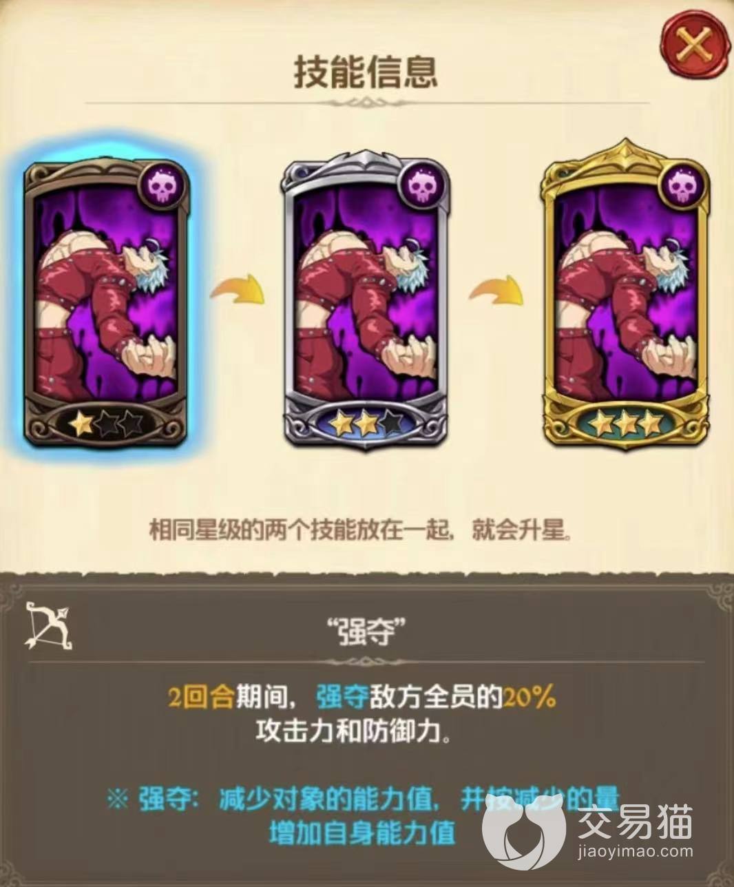 第2个技能强夺,可以强夺敌方全员20%的攻击力和防御力,两个回合期间就会生效,而且技能效果可以持续三个回合,比例最多能够达到50%,能够加到自己的身上,让自己变得更强。