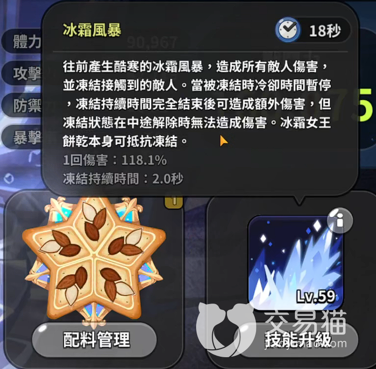 冰霜女王饼干的技能可以产生非常强大的冰霜风暴,能对敌人造成强力的冰冻效果。对所有敌方单位造成伤害的同时,并可以冻结接触到的敌人。当敌人处于被冻结情况下,基本上是处于一个时间暂停的状态,无论是技能也好,亦或者是普通攻击也罢,都无法进行,属于是一个非常强力的控制。