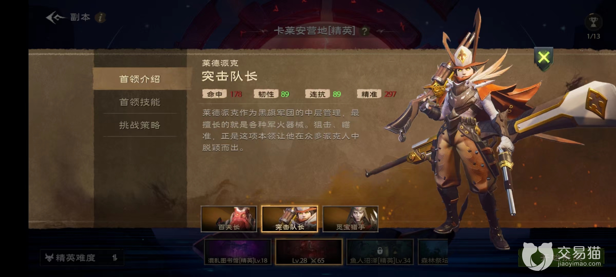 突击队长技能包括麻醉弹,狙击步枪和装填弹药以及火力支援等。挑战时候如果被麻醉弹命中则立即停止移动,不然会触发眩晕。注意躲开狙击步枪施法范围。该技能造成的是矩形伤害,装填时间三秒钟,完全有时间躲开。在首领释放子弹风暴时要远离伤害范围,一旦其靠近弹药箱完成装填前要全力将弹药箱破坏掉,不能使其进行弹药补充。