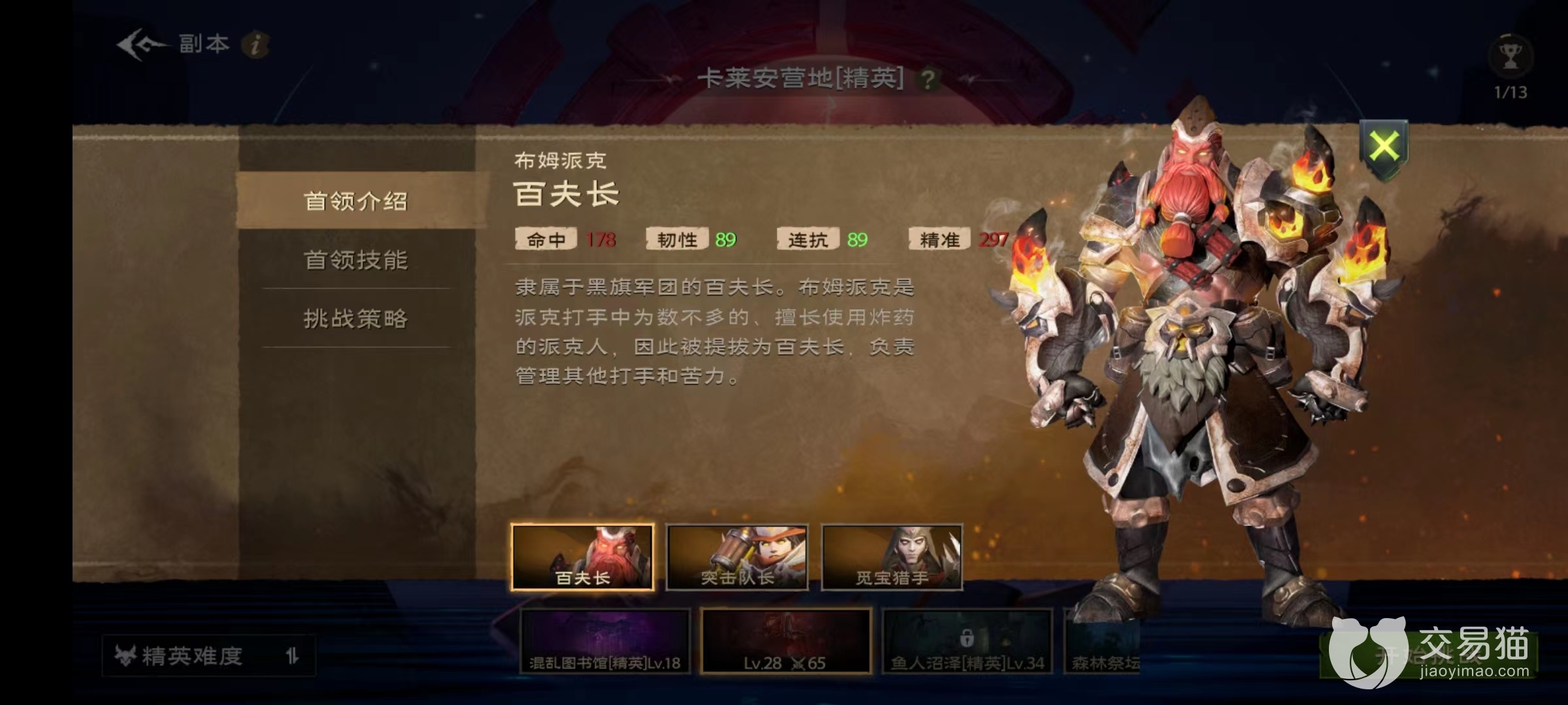 卡莱安营地三个boss分别是百夫长、突击队队长和觅保猎手,和其他副本不同,这里面首领都是人形怪物。第1个百夫长主要技能包括爆破手雷、爆裂重拳和召唤支援这三个。能够召唤出手下推出矿车沿着轨道行进,并且不断对玩家投掷炸弹,爆裂重拳需要读条之后朝玩家最密集方向释放伤害,爆破手雷泽是随机点名,对当前非仇恨最高玩家连续投掷炸弹会形成燃烧区域。在挑战时一定要注意躲开投掷的爆破手雷,而后躲开爆裂重拳,尽量不要站得太过密集。当释放召唤支援后,如果出现的是运兵车则利用扳手将铁道搬向悬崖,反之则搬向路障。
