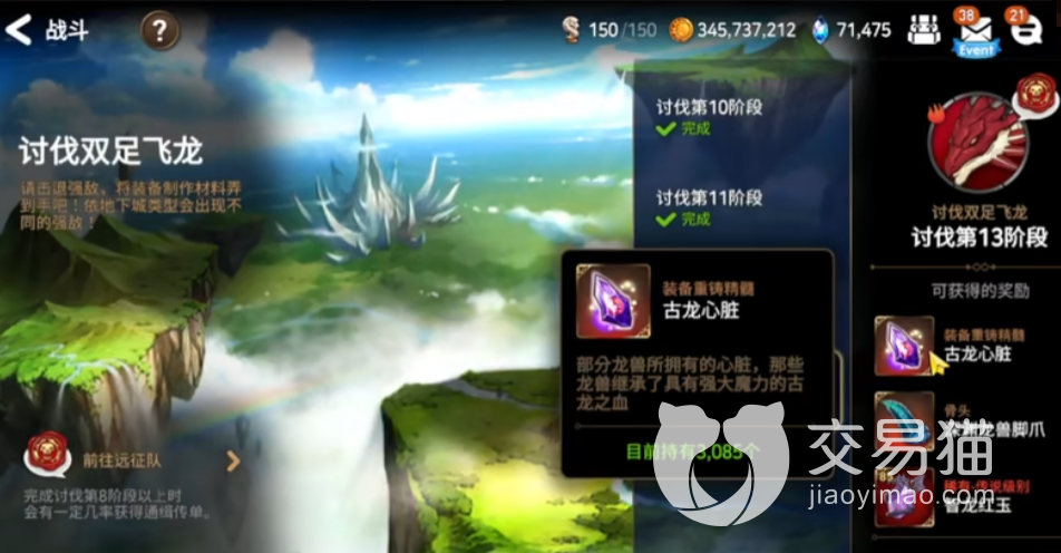 2、如何获取:玩家在打龙讨伐的时候是会掉这个古龙心脏的,而这个副本是玩家经常回去刷的,玩家刷的越多掉落的也就会越多。同时该道具的掉落也是很可观的,并不是一个一个的掉落,一次是能够掉落很多的。不过即便如此重铸一次装备也是需要用到200个古龙心脏的。