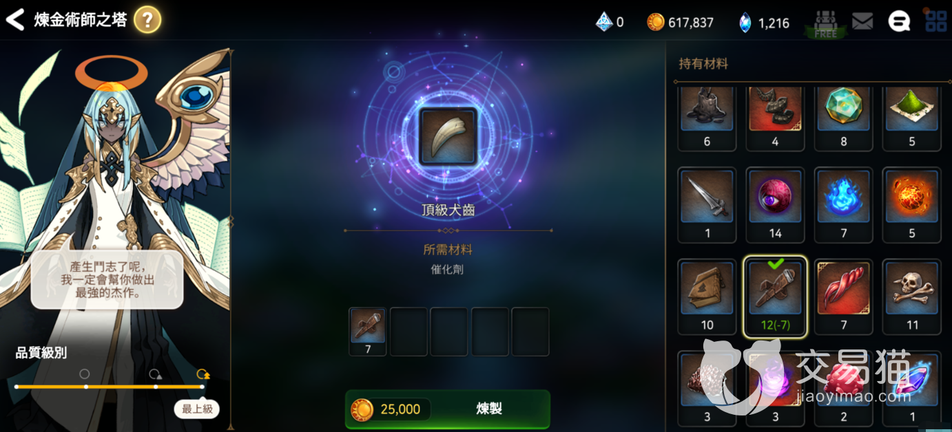 3、炼金术获取:炼金术师塔这里也是可以制作催化剂的,进入之后点击中间位置的“催化剂”就可以进行制作了。不过既然是炼金术,那么多少是要付出一些代价来的。比如使用7个A的催化剂只能制作出4个B催化剂,那么大家就会亏损三个。这个方法一般只是用在应急的时候,通常情况下是不推荐大家这样去置换的。