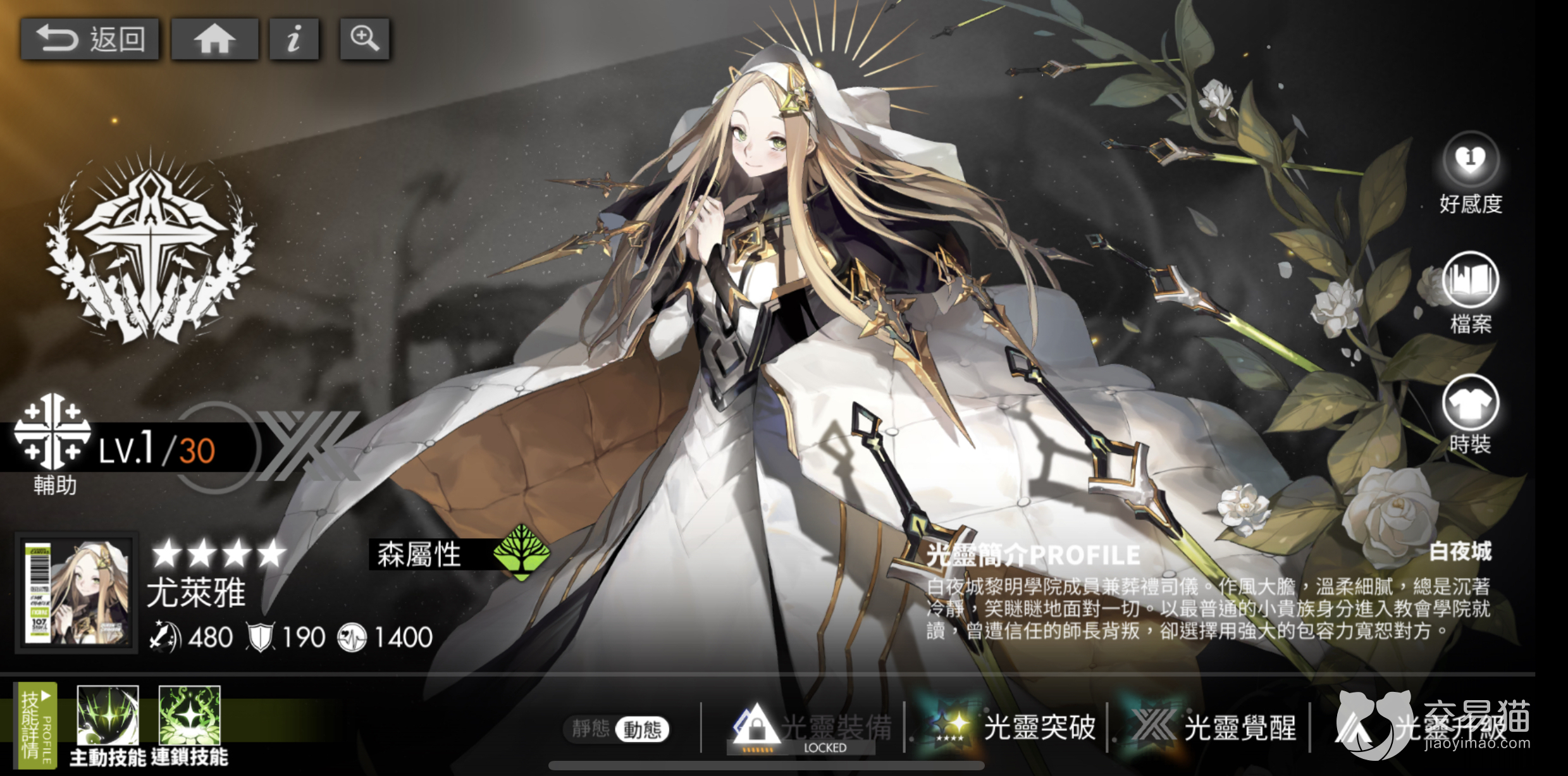 尤莱雅作为白夜城黎明学院的成员兼葬礼司仪,定位为辅助,是一名获取难度非常低的森系四星辅助角色。尤莱雅的技能组效果都与回复相关,主动技能除了为队伍中成员提供血量回复之外,还会额外将离自身最近的森属性各自转变为强化格子,提供普通格子两倍的连线伤害倍率加成。在新手开荒的过程中十分百搭,前期全森队必备的光灵之一。